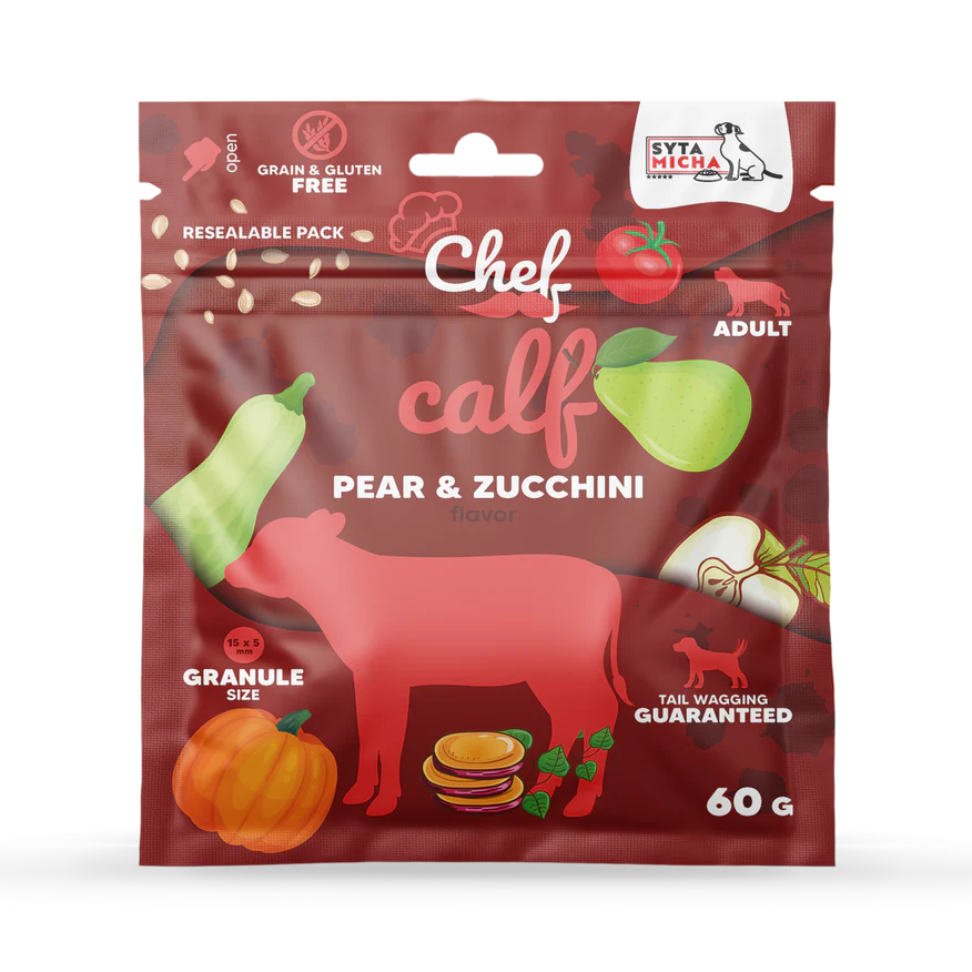 Syta Micha Telecí maso, hruška a cuketa je kompletní, bezobilné a monoproteinové krmivo určené pro dospělé psy všech plemen. Receptura obsahuje: