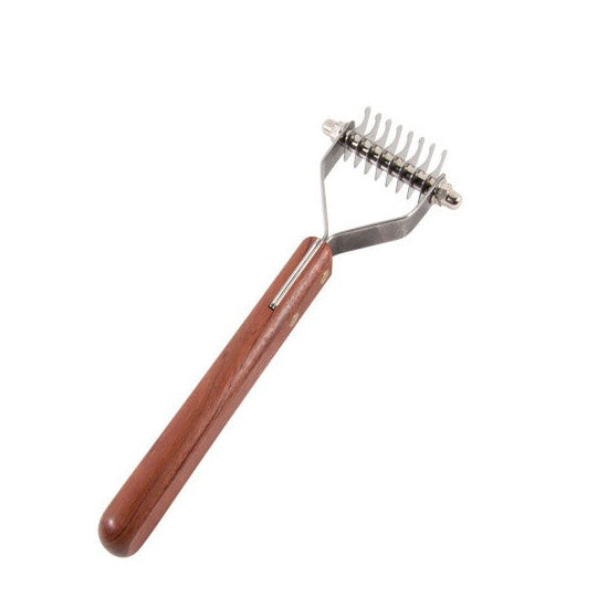 Ergonomicky tvarovaná rukojeť z kvalitního dřeva dobře padne do dlaně a zajišťuje komfortní držení i při delší práci. Promyšlené provedení hrabla pomáhá snižovat namáhání kloubů a zároveň umožňuje plynulý, efektivní grooming s minimální námahou.