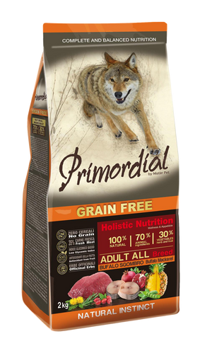 Primordial buvol a makrela je kompletní holistické krmivo bez obilovin, které přináší originální kombinaci živočišných bílkovin s vysokou nutriční hodnotou. Díky použití méně běžného zdroje masa představuje tato receptura také nižší riziko alergických reakcí.