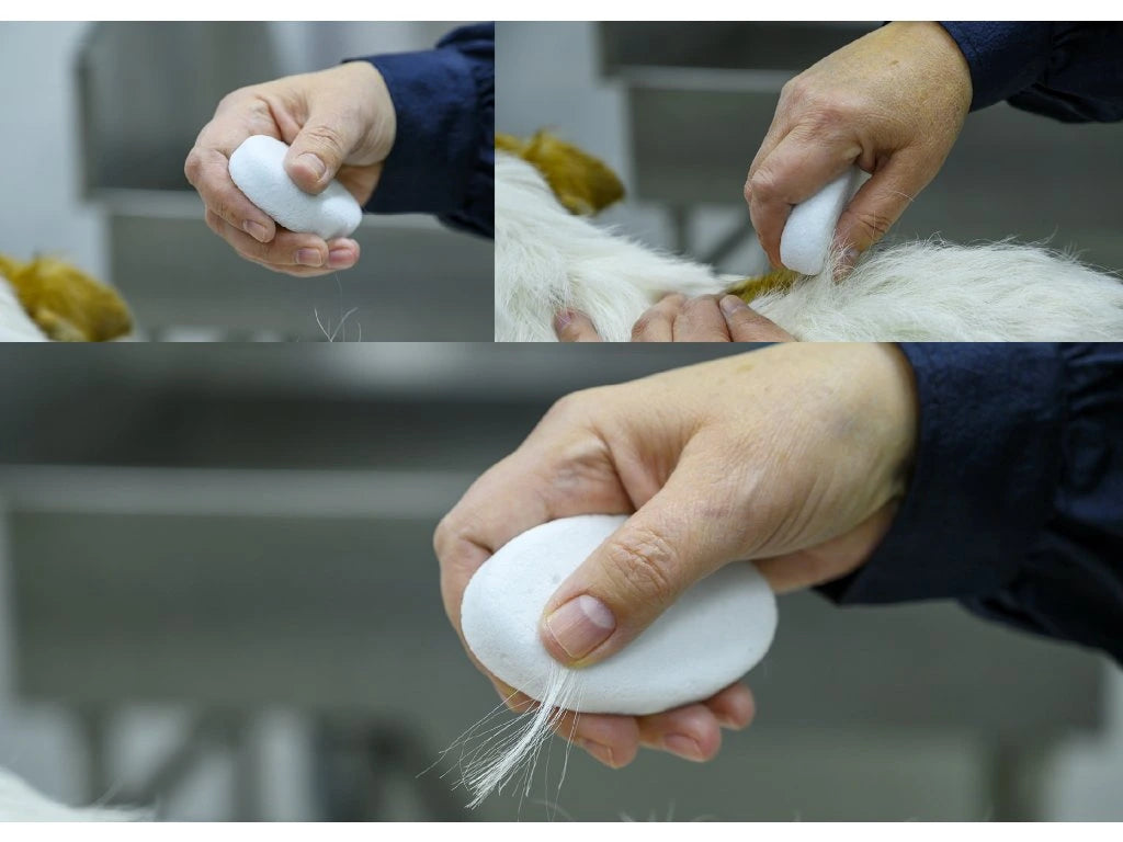 Pemzu uchopte do dominantní ruky, druhou rukou jemně přidržte kůži zvířete. Bez velkého tlaku kartáčujte srst ve směru růstu, abyste se vyhli odumřelé chlupy a podsadu.