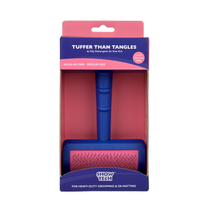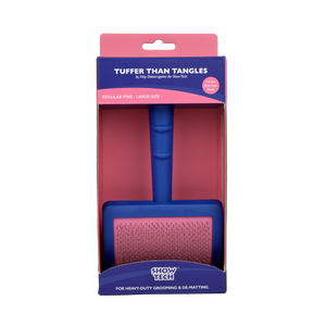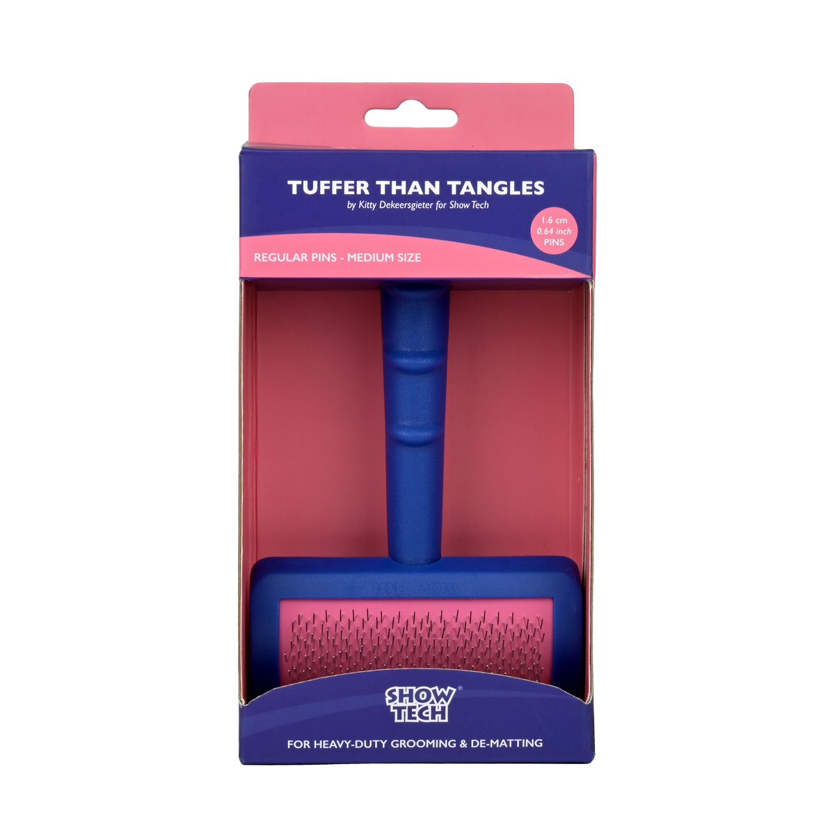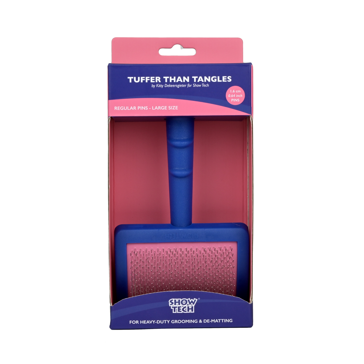 Ideální pro účinné rozčesávání srsti u všech plemen. Dlouhá ergonomická rukojeť s tvarovaným úchopem dokonale přistupovat na těžko dostupná místa díky zakřivené hlavě. Speciální podložka se zahnutými zuby je klíčem k úspěchu těchto vynikajících kartáčů. Tuffer Than Tangles zajišťuje rychlé odstranění dredů a rozčesávání husté srsti, přičemž je navržen pro efektivní odstraňování mazu u všech plemen. Extra dlouhé, měkké drátky pronikají rychleji a hlouběji do husté srsti, jsou pevné, ale zároveň pružné, takže šetrné a rychlé kartáčování bez poškození srsti.